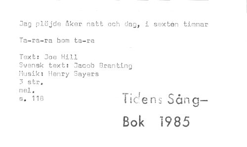//// Jag plöjde åker natt och dags i sextån timmar Ta-ra-ra bom ta-ra //// Text: Joe Hill //// Svensk text: Jacob Branting Musik: Henry Sayers //// 3 str. //// mel. //// s. 118 _en Sång— //// Bok 1985 ////