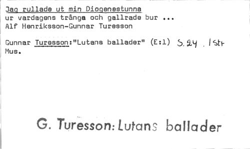 //// Jaq rullade ut min Diooenestunna //// ur vardagens trånga och gallrade bur ... Alf Henriksson-Gunnar Turesson //// Gunnar Turesson:"Lutans ballader" (E:1) 5,9,9 IshMus. //// G. Turesson: Lutans ballader ////
