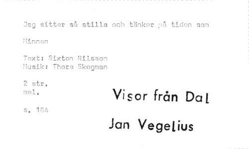 //// Jag sitter så stilla och tänker på tiden som Minnen //// Text: Sixten Nilsson //// Musik: Thore Skogman //// 2 str. //// mel. Visor från Daj //// s. 184 //// Jan Vegetius ////
