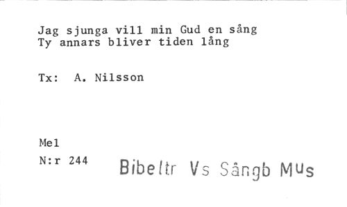 //// Jag sjunga vill min Gud en sång Ty annars bliver tiden lång //// Tx: A. Nilsson //// Mel //// N:r 244 Bibe!tr Ids Sångb Mus ////