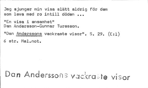//// Jag sjunger min visa slätt aldrig för dem som leva med ro intill döden ... //// "En visa i ensamhet" //// Dan Andersson-Gunnar Turesson. //// "Dan Anderssons vackraste visor". S. 29. (E:1) 6 str. Mel.not. //// Dan Andersson 3 vackra te visor ////