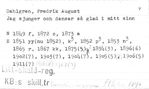 //// V //// Dahlgren, Fredrik August //// Jag sjunger och dansar så glad i mitt sinn //// N 1849 f, 1872 c, 1873 a //// E 1851 yy(nu 1852), k3, 1852 p3, 1853 n5, //// 1865 r, 1867 kk, 1875(54-,1894(3), 1896(6) //// 19o2(7), 19o3(7), 1904(7), 1905(5)., 1906(5) //// 1911(7)i //// 9, //// KB:s skilt tr ////
