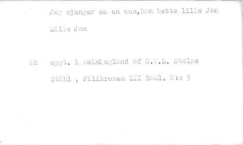 //// Jag sjunger om en manlhan hette lille Jan A-Jille Jon //// Lk uppt. i JAelsincland af //// Ståhl Filikromen III Sand. N:0 5 ////