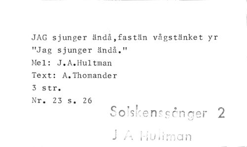 //// JAG sjunger ändå,fastän vågstänket yr "Jag sjunger ändå." //// Tefel: J.A.Hultman //// Text: A.Thomander //// 3 str. //// Nr. 23 s. 26 //// ens rF, //// j e i a n ////