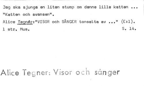 //// Jag ska sjunga en liten stump om denne lille katten "Katten och svansen". //// Alice ybondr:"VISOR och SÅNGER tonsatta av ..." (E:1). 1 str. Mus. S. 14. //// Alice Te6ner: Visor oså sånger ////