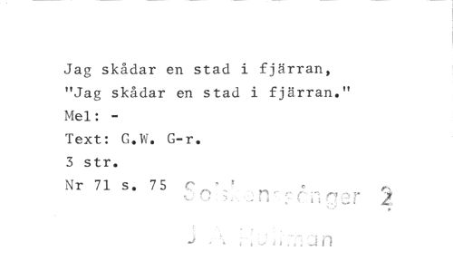 //// Jag skådar en stad i fjärran, "Jag skådar en stad i fjärran." Ivlel : //// Text: G.W. G-r. //// 3 str. //// Nr 71 s. 75 n O r ////