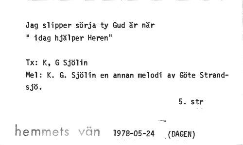 //// Jag slipper sörja ty Gud är när " idag hjälper Heren" //// Tx: K, G Sjölin //// Mel: K. G. Sjölin en annan melodi av Göte Strandsjö. //// 5. str //// hemmets vän 1978-05-24 (DAGEN) ////