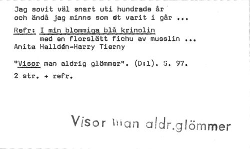 //// Jag sovit vål snart uti hundrade år och ändå jag minns som dt varit i går //// Refr: I min blommiga blå krinolin //// med en florslätt fichu av musslin Anita Hallddn-Harry Tierny //// "Visor man aldrig glömmer". (D:1). 6. 97. 2 str. + refr. //// Visor lisan aldr.giömmer ////