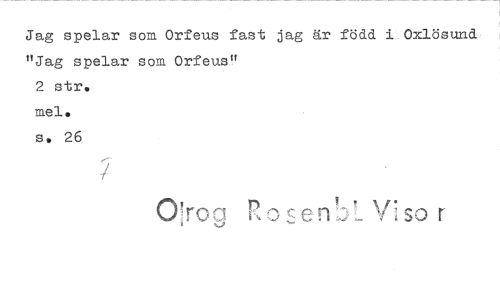 //// Jag spelar som Orfeus fast jag är född i Oxlösund "Jag spelar som Orfeus" //// 2 str. //// inel. //// s. 26 //// 1' //// O!rog Rose T V: so r ////