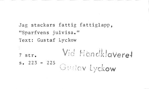 //// Jag stackars fattig fattiglapp, "Sparfvens julvisa." //// Text: Gustaf Lyckow //// 7 str. Vid HändidaVere4 //// s. 223 - 225 cv ryckow ////