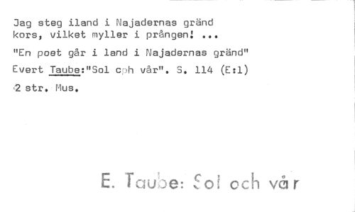 //// Jag steg iland i Najadernas gränd kors, vilket myller i prången! //// "En poet går i land i Najadernas gränd" Evert Taube:"Sol cF)f, vår". S. 114 (E:1) ,2str. Mus. //// E. Tau:De: Sot och vå r ////