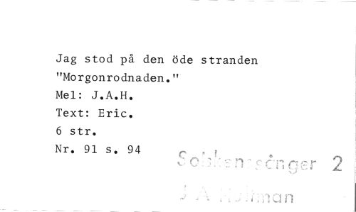 //// Jag stod på den öde stranden "Morgonrodnaden." //// Mel: J.A.H. Text: Eric. 6 str. //// Nr. 91 s. 94 //// 0 ////