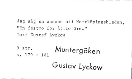 //// Jag såg en annons uti Norrköpingsbladen, "En fästmö för åttio öre." //// Text Gustaf Lyckow //// 9 str. Muntergöken //// s. 179 - 181 //// G ustav Lyckow ////