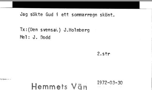 //// Jag sökte Gud i ett sommarregn skönt. //// Tx:(Den svensa) J.Holmberg Mel: J. Dodd //// 2.str //// 1972-03-30 //// Hemmets Vem ////