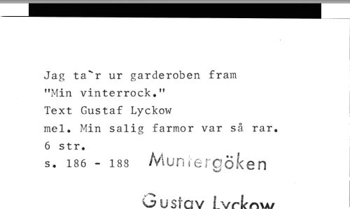 //// Jag ta'r ur garderoben fram //// "Min vinterrock." //// Text Gustaf Lyckow //// mel. Min salig farmor var så rar. 6 str. //// s. 186 - 188 Mun'. er,-cöken //// ustav Lvrk"w ////