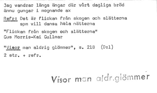 //// Jag vandrar längs ängar där vårt dagliga bröd ännu gungar i mognande ax //// Refr: Det är flickan från skogen och slätterna spm vill dansa håla nätterna //// "Flickan från skogen och slätterna" Gus Morris-Kai Gullmar //// "Visor man aldrig glömmer", s. 218 (D:1) 2 str. + refr. //// Visor min ardnaiömmer ////