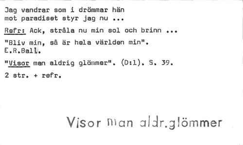 //// Jag vandrar som i drömmar hän //// mot paradiset styr jag nu ... //// Refr: Ack, stråla nu min sol och brinn ... //// "Bliv min, så är hela världen min". E.R.Ball. //// "Visor man aldrig glömmer". (D:1). S. 39. 2 str. + refr. //// Visor man Idreglörnmer ////