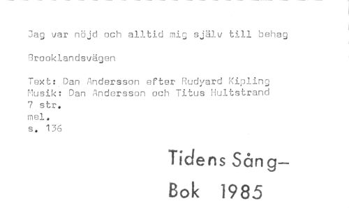 //// Jag var nöjd och alltid mig själv till behag erooklandsvägen //// Text: Dan Andersson efter Rudyard Kipling Musik: Dan Andersson och Titus Hultstrand 7 str. //// mei. //// s. 136 //// Tidens Sång— //// Bok 7985 ////
