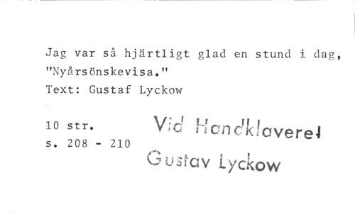 //// Jag var så hjärtligt glad en stund i dag, "Nyårsönskevisa." //// Text: Gustaf Lyckow //// 10 str. Vid Hon didaverei //// s. 208 - 210 //// G ustav Lyckow ////