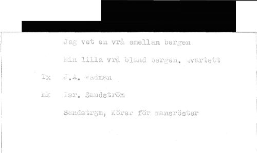 //// Jag vet en vrå emellan bergen //// vk,in lilla vrå bla-d bergen. •vartett lx j.A. iaciman //// isr. Sandström //// Sandström, Körer för mansröster ////