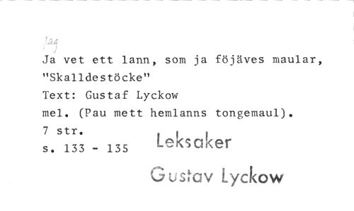 //// Ja vet ett lann, som ja föjäves maular, "Skalldestöcke" //// Text: Gustaf Lyckow //// mel. (Pau mett hemlanns tongemaul). 7 str. //// s. 133 - 135 Leksaker //// Gustav Lyckow ////