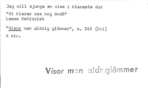 //// Jag vill sjunga en visa i klaraste dur //// "Vi klarar oss nog ändå" Lasse Dahlqvist //// "Visor man aldrig glömmer", s. 242 (D:1) 4 str. //// Visor min akingiömmer ////