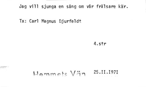 //// Jag vill sjunga en sång om vår frälsare kär. Tx: Carl Magnus Djurfeldt //// 4.str //// nimPts Vgin 25.11.1971 ////