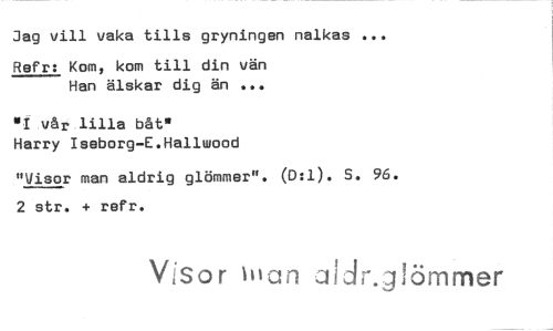 //// Jag vill vaka tills gryningen nalkas //// Refr: Kom, kom till din vän Han älskar dig än //// vår lilla båt" //// Harry Iseborg-E.Hallwood //// "Visor man aldrig glömmer". (D:1). S. 96. 2 str. + refr. //// Visor Illan car.g1örnmer ////