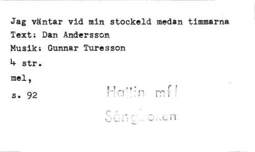 //// Jag väntar vid min stockeld medan timmarna Text: Dan Andersson //// Musik: Gunnar Turesson //// 4 str. mein //// rY //// s. 92 F . ////
