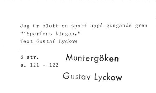 //// Jag är blott en sparf uppå gungande gren Sparfens klagan." //// Text Gustaf Lyckow //// 6 str. Mun te rgöken //// s. 121 - 122 //// G u stav Lyckow ////