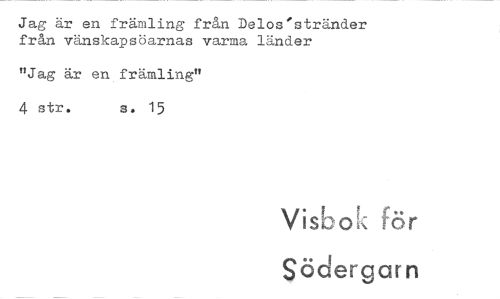 //// Jag är en främling från Delos'stränder från vänskapsöarnas varma Linder //// "Jag är en främling" 4 str. s. 15 //// Visbok för //// Södergarn ////