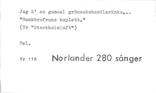 //// Jag ä' en gammal grönsakshandlaränka,.. "Munkbrofruns kuplett." //// (Ur "Stockholmluft") //// Mel. //// Nr 118 Norlander 280 sånger ////