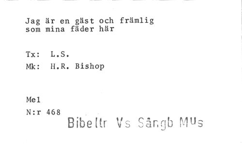 //// Jag är en gäst och främlig som mina fäder här //// Tx: L.S. //// Mk: H.R. Bishop //// Mel //// N:r 468 //// BibeRr Vs Sångb Mus ////