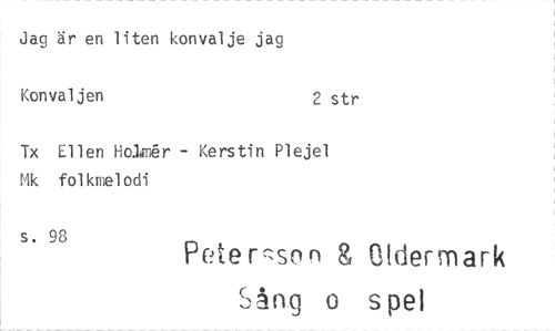 //// Jag är en liten konvalje jag Konvaljen 2 str //// Tx Ellen Hoichr - Kerstin Plejel Nk folkmelodi //// s. 98 Peterson g etclermark //// Sång o spel ////