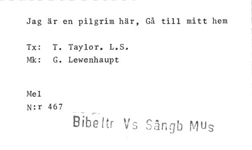//// Jag är en pilgrim här, Gå till mitt hem //// Tx: T. Taylor. L.S. Mk: G. Lewenhaupt //// Mel //// N:r 467 //// 131be Vs Sångb Mus ////