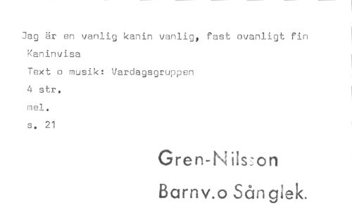 //// Jag är en vanlig kanin vanlig, fast ovanligt fin Kaninvisa //// Text o musik: Vardagsgruppen //// 4 str. //// nel. //// s. 21 //// Gren-N ilsADn //// Barnv.o Sån Ok. ////