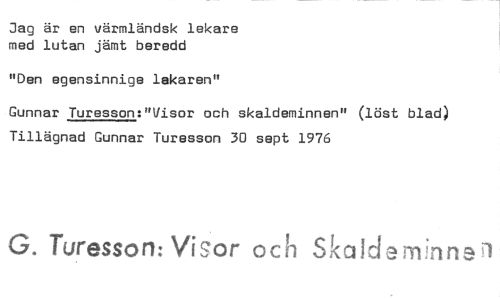 //// 3ag är en värmländsk lekare med lutan jämt beredd //// "Den egensinnige lakaren" //// Gunnar Turesson:"Visor och skaldeminnen" (löst blad) Tillägnad Gunnar Turesson 30 sept 1976 //// G. Turesson: Visor och Skaidernrine ////