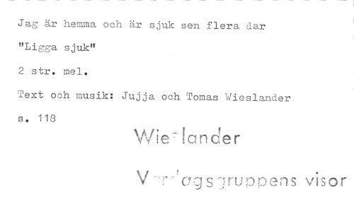 //// Jag är hemma och är sjuk sen flera dar "Ligga sjuk" //// 2 str. mel. //// Text och musik: Jujja och Tomas Wieslander s. 118 //// Wie !a der //// V togs7truppens visor ////