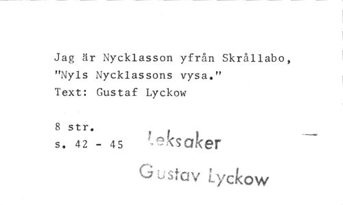 //// Jag är Nycklasson yfrån Skrållabo, "Nyls Nycklassons vysa." //// Text: Gustaf Lyckow //// 8 str. ks eker //// s. 42 - 45 G ;J Lyckow ////