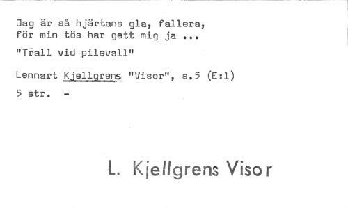 //// Jag är så hjärtans gla, fallera, för min tös har gett mig ja //// "Tisall vid pilevall" //// Lennart Kjellorens "Visor", s.5 (E:1) 5 str. //// 1. Kjellgrens Visor ////