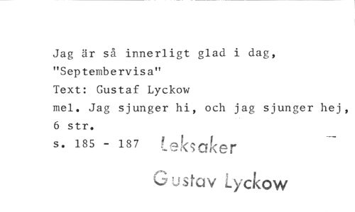 //// Jag är så innerligt glad i dag, "Septembervisa" //// Text: Gustaf Lyckow //// mel. Jag sjunger hi, och jag sjunger hej, 6 str. //// s. 185 - 187 ,eicaker //// Gustav Lyckow ////