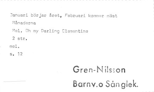//// januari börjar året, Februari kommer näst Månaderna //// Mel. Oh my Darling Clementins //// 2 str. //// mel. //// s. 12 //// Gren-Nilss.on //// Barnv.o Sån glek. ////