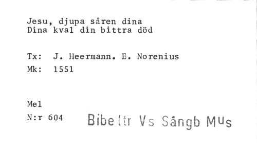 //// Jesu, djupa såren dina Dina kval din bittra död //// Tx: J. Heermann. E. Norenius Mk: 1551 //// Mel //// N:r 604 Bibe (tr Vs Sångb Mus ////