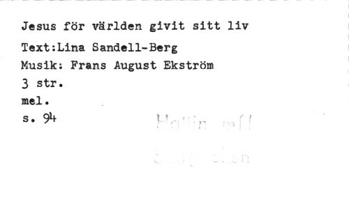 //// Jesus för världen givit sitt liv //// Text:Lina Sandell-Berg //// Musik: Frans August Ekström 3 str. //// mel. //// s. 94 ////