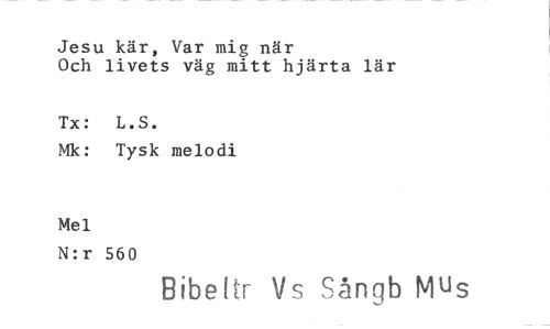 //// Jesu kär, Var mig när //// Och livets väg mitt hjärta lär //// Tx: L.S. //// Mk: Tysk melodi //// Mel //// N:r 560 //// Bibeltr Vs Sångb Mus ////