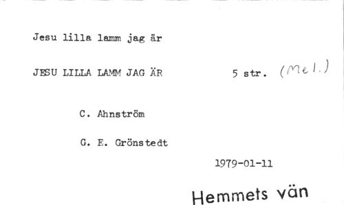 //// Jesu lilla lamm jag är 5 str. ) //// JESU LILLA LAMM JAG ÄR //// C. Ahnström //// G. E. Grönstedt //// 1979-01-11 //// Hemmets vän ////
