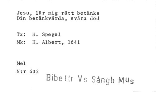 //// Jesu, lär mig rätt betänka //// Din betänkvärda, svåra död //// Tx: H. Spegel //// Mk: H. Albert, 1641 //// Mel //// N:r 602 //// Bibe E r ids Sångb Mus ////