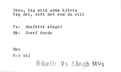 //// Jesu, tag mitt arma hjärta Tag det, sköt det som du vill //// Tx: Ahnfelts sånger Mk: Josef Haydn //// Mel //// N:r 562 //// Bibefir Vs Sångb Mus ////
