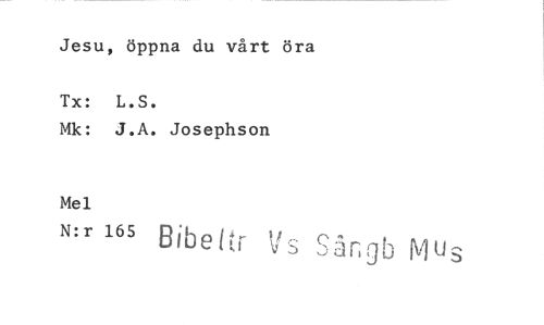 //// Jesu, öppna du vårt öra //// Tx: L.S. //// Mk: J.A. Josephson //// Mel //// N:r 165 13ibeltr Sångb Mus ////