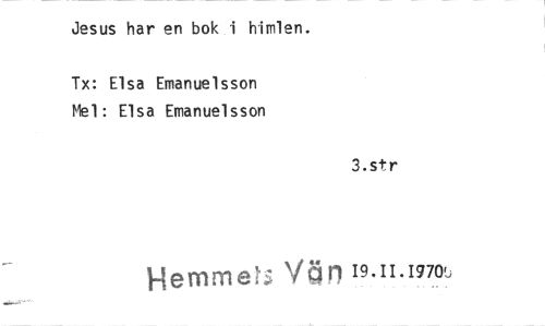 //// Jesus har en bok i himlen. //// Tx: Elsa Emanuelsson Mel: Elsa Emanuelsson //// 3.str //// Herrinn te; Vt5r, 19.11.1970u ////
